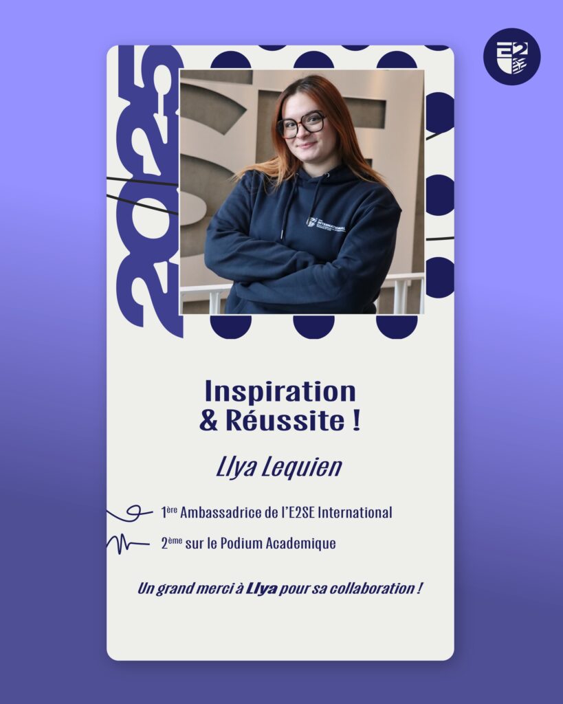 Inspiration & Réussite : Llya Lequien, ambassadrice étudiante pendant 1 an, s’est distinguée par ses résultats en se hissant à la 2ᵉ place du podium académique. Encore bravo à elle !