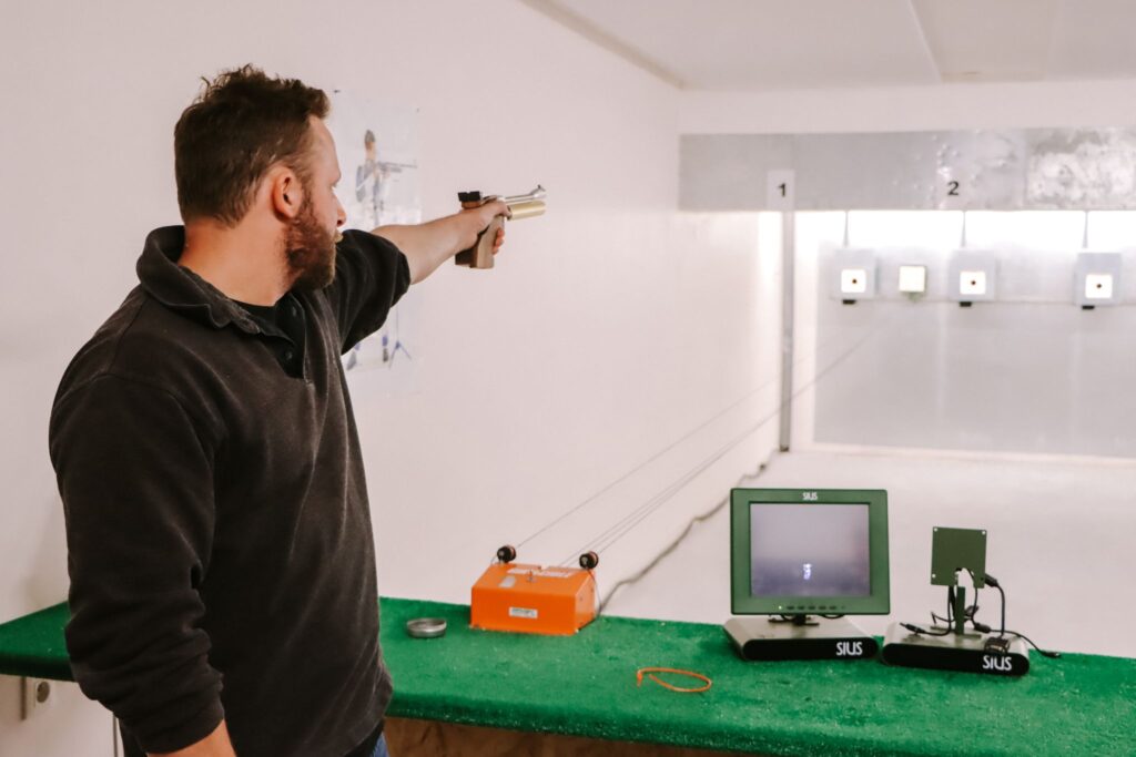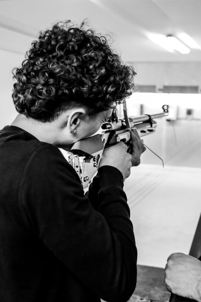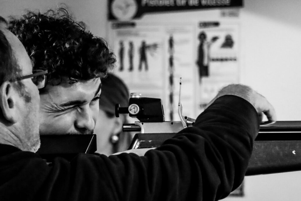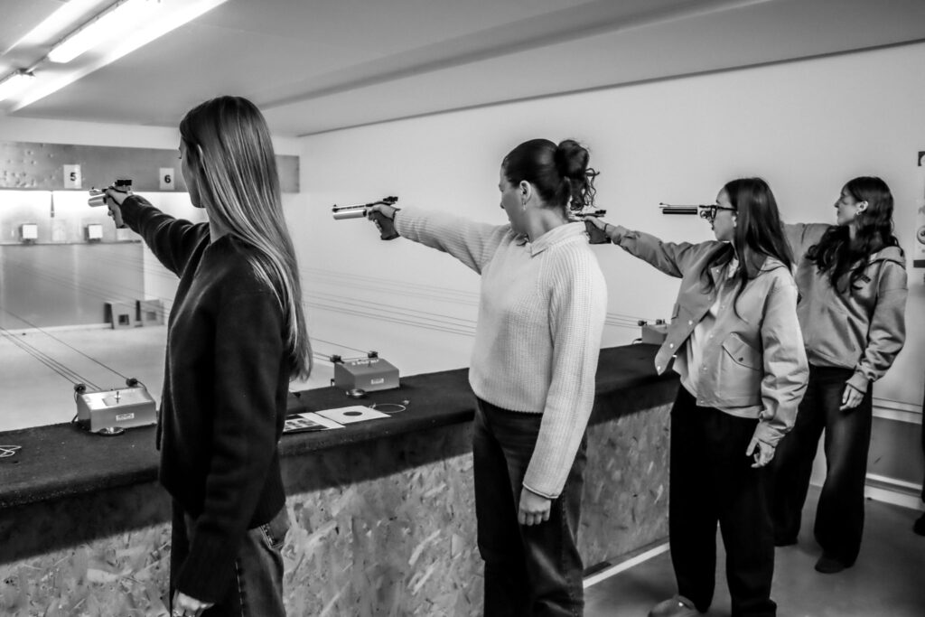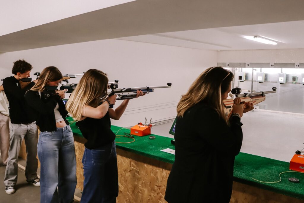 1️⃣ Immersion sur le terrain : Les étudiants ont été invités au club de Bretteville-sur-Odon, pour découvrir et s’initier au tir sportif. Cette expérience a permis de briser les préjugés sur la discipline et de mieux comprendre l’univers visuel et les valeurs de la ligue. Pistolet, carabine, cibles… chacun a pu tester et ressentir la pratique de manière concrète.